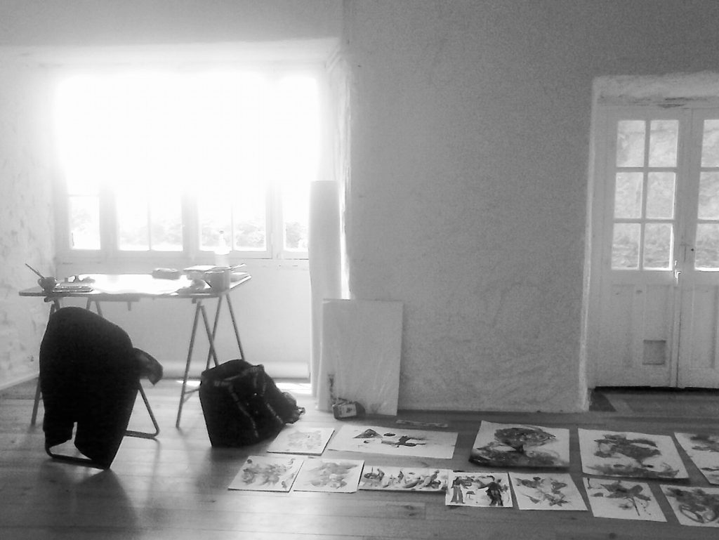 « Je suis venue 10 jours en résidence, avant d’arriver je m’étais donné un projet ; celui de créer des univers illustrés pour ensuite pouvoir raconter ou reprendre des récits et poèmes que j’ai écris et les mélanger aux dessins, faire de ces dessins une histoire. Je n’avais pas d’idée précise, seulement faire de l’illustration. J’ai trouvé l’inspiration pratiquement tout de suite, je suis arrivée je me suis installée et j’ai commencé à dessiner dans un atelier magnifique, avec de grandes fenêtres le long des murs, j’en ouvrais parfois une. Il y a des hirondelles qui viennent rendre visite ce qui créé une ambiance féerique. J’ai profité du soleil pour dessiner dehors avec une vue superbe sur la nature, sur les gens qui vivent dans le lieu, les gens qui passent, puis dans le salon, la grande pièce à vivre où j’ai passé les derniers jours de création, ce salon est sublime et m’a donné un bel élan de créativité, de plénitude, c’est là que j’ai fait l’exposition et où j’ai rencontré des gens géniaux qui se sont arrêtés sur mes dessins et avec qui j’ai eu de beaux retours.